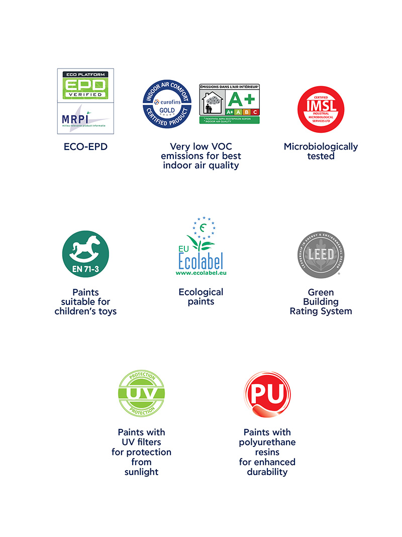 Экологичная антимикробная акрил - полиуретановая эмалевая краска на водной основе, для внутренних и наружных поверхностей из дерева, металла, штукатурки, стекла, алюминия и др. Сертифицирована согласно стандарта Органа Экомаркировки Греции (ASAOS), согласно стандарта 71-3:2013 Органа Экомаркировки EC, как не выделяющая тяжелые металлы, в разделе с детскими игрушками и предметами, и в Industrial Microbiological Services Ltd Registered in England как гипоаллергенная и антимикробная, согласно стандарта ISO 22196: 2007. Проста в нанесении, равномерно ложится на поверхность, не оставляя разводов и подтеков. Обладает идеальной белизной, хорошей укрывистостью, высокой стойкостью к частому мытью, а также отличной адгезией, даже к поверхностям, окрашенным алкидными красками (масляные краски). Краска практически не имеет запаха, не содержит аммиак и другие опасные вещества и соединения (ароматические углеводороды, свободный формальдегид, тяжёлые металлы, алкилфенолэтоксилатные соединения. и др.).